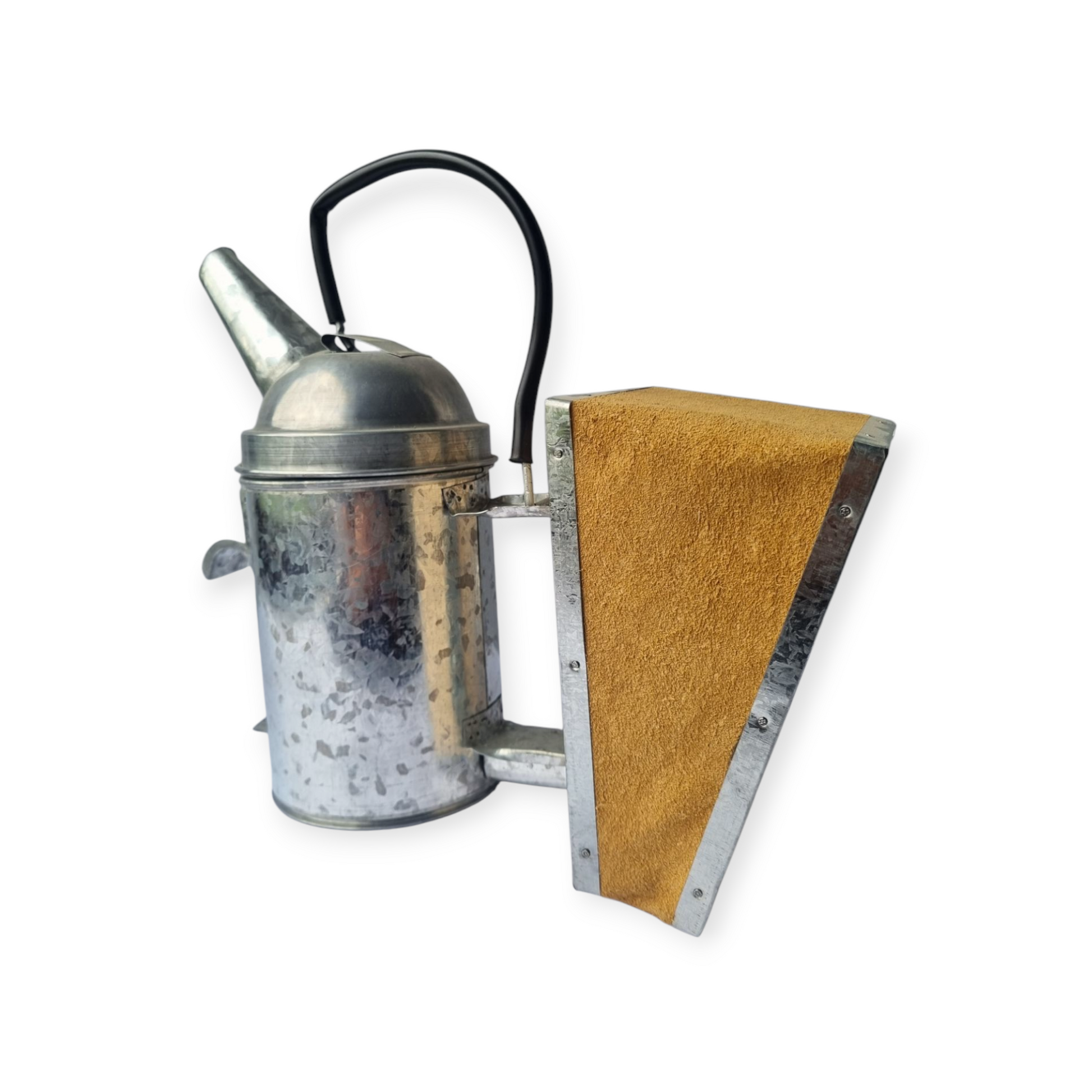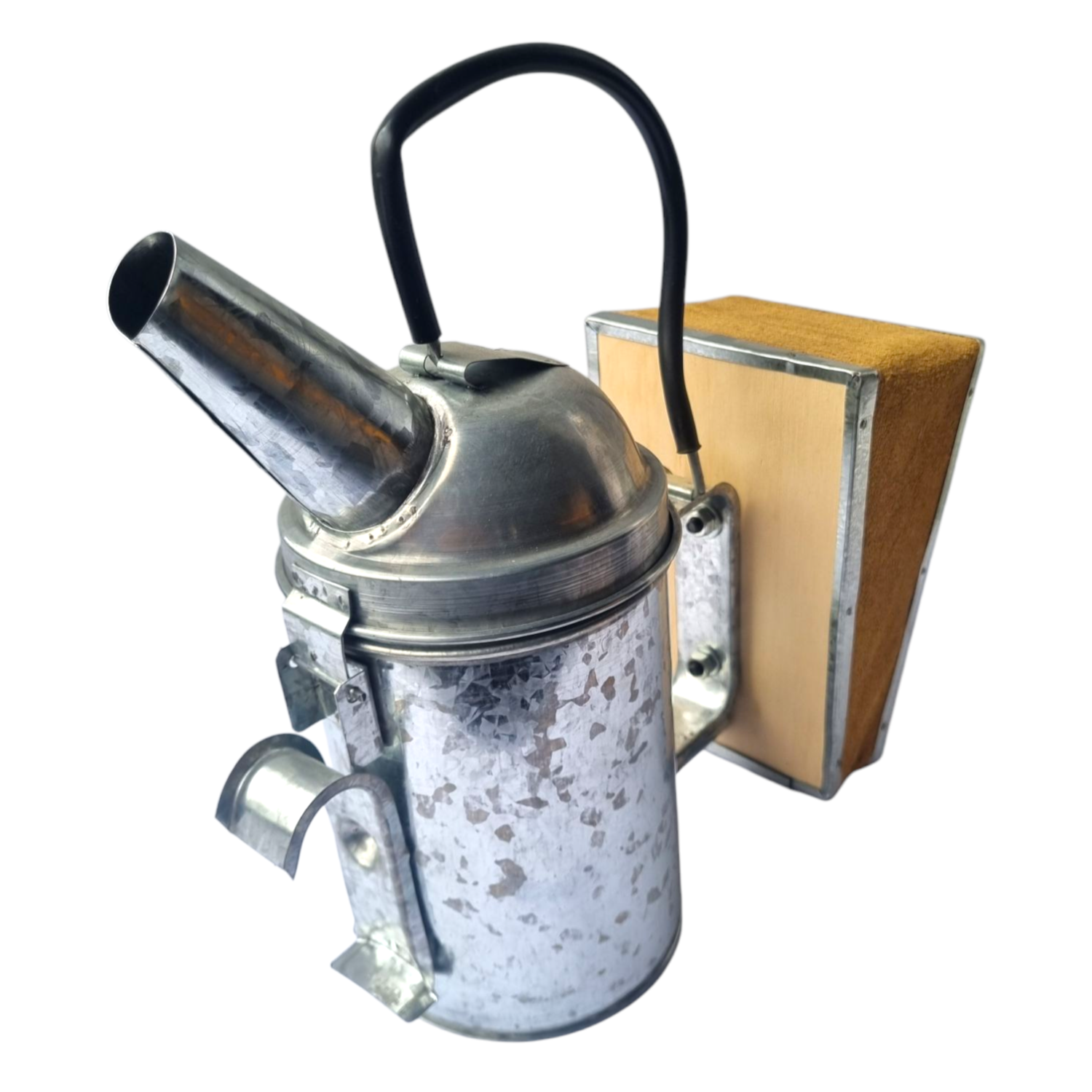 Dispositivo de acero inoxidable para generar humo y calmar a las abejas, facilitando el manejo seguro de la colmena.